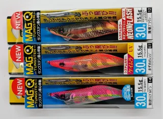 Lote de tres señuelos para pesca Eging MAG-Q TUNGSTEN. - Modelo: MAG-Q TUNGSTEN. - Peso: 15.5g. - Talla: 3.0. - Colores: Neonflash Red, Keimura UV Nichu Pink, Keimura UV Monster Master. - Sistema de transferencia de peso con imán y tungsteno.