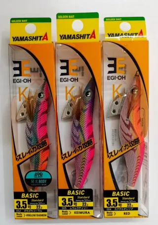 Lote de tres señuelos YAMASHITA EGI-OH K. - Modelo: BASIC Standard. - Tamaño: 3.5 - Peso: 22g. - Sinking rate: 3.0 s/m. - Colores: 490GLOW/RAINBOW, KEIMURA, RED.