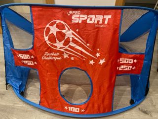 Portería de fútbol plegable con diseño llamativo y puntos para jugar. Se puede usar normal o con puntuación Usado 2 veces - Estructura de tela roja y azul. - Balón de fútbol con estrellas y líneas de movimiento. - Puntuaciones de 500, 250 y 100 puntos. - Agujero central para lanzar. - Red lateral