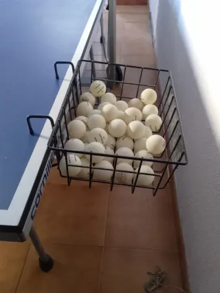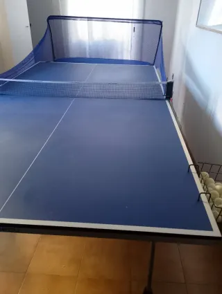 Mesa de tenis de mesa. Color azul. Cornilleau, France, modelo "One indoor". Largo ancho de la tabla: estándar (274 cm x 152.5 cm). Ancho del aglomerado de la tabla: 18 mm, ancho total con los bordes: 28 mm. Incluye mesa, atrapa pelotas de malla azul posterior, recipiente metálico para bolas Donic, recogepelotas Butterfly, pelotas (son más de las que aparecen, alrededor de unas 80 pelotas), la funda protectora para guardar la mesa y la guía en papel. En perfectas condiciones. - Superficie de juego azul. - Red de tenis de mesa incluida. - Estructura plegable para fácil almacenamiento.