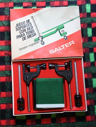 Set de soportes y red para tenis de mesa de la marca Salter. Incluye los postes y la red en su caja original.La red mide 1,17 m de largo y 14,5 cm de alto. Red y soportes en perfecto estado.La caja con señales del paso del tiempo y alguna rotura,peró aún funcional.Soportes con sistema de sujeción a la mesa y tensión regulable.