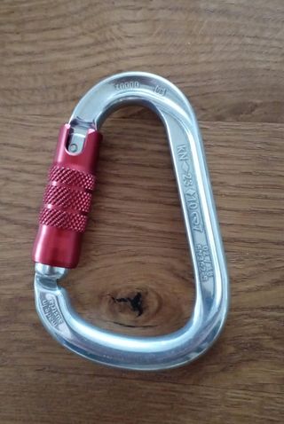 Main material aluminium / anodized Maincolor red Weight 87g Length 110mm Width 72 mm Min. breaking load in longitudinal direction 23 kN Min. breaking load in the minor axis 10 kN Min. breaking load with open gate 7 kN Lock 3-way autolock Gate opening 25 mm Made in Austria - Material: Aluminio. - Cierre: Rosca. - Color: Plateado con detalles en rojo. - Marcaje: KN 23 kN / 10 kN / 7 kN. - Certificación: EN 362-B. - Fabricado en Austria. Dispongo de mas unidades