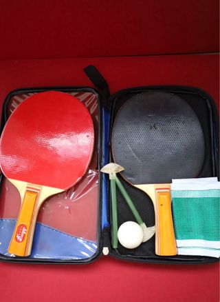 Set de ping pong para casa. - Incluye red y dos palas. - Diseño compacto y portátil. - Se instala en cualquier mesa. **No tiene pelotas ***La caja tiene una rotura