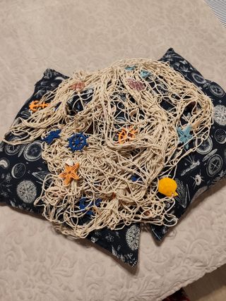 2 fundas de cojines con motivos náuticos, regalo relleno. Red de pesca decorativa con adornos náuticos, 160cm de Largo. - Hecha de yute y adornada con elementos de madera - Incluye conchas, estrellas de mar, timones y anclas. - Incluye pinzas para colgar fotografías
