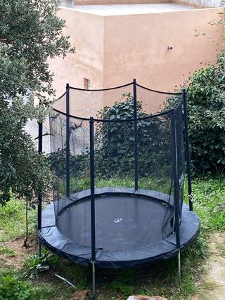 Cama elástica de 235 cm de diámetro con red de seguridad. 2,35 metros de diámetro, que ofrecen 3m2 de superficie de salto segura. ¡Ni tornillos ni herramientas! Fácil de montar y guardar en invierno. Puede soportar hasta 100kg. Muy estable gracias a los 6 puntos de apoyo. - Marca: Decathlon. - Diámetro: 235 cm. - Incluye red de seguridad. Se puede venir a recoger en Tordera.