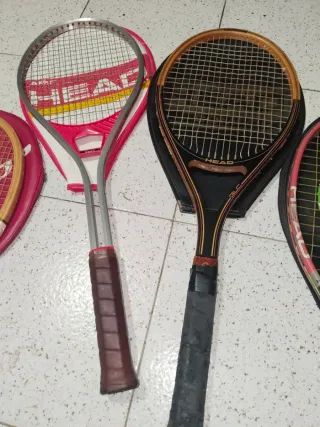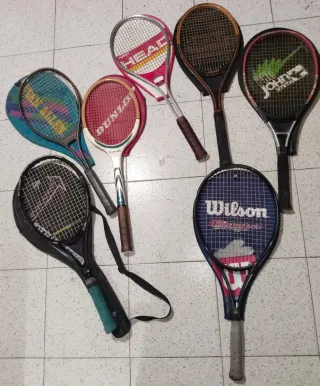 Conjunto de raquetas de lo que creo que es Fronton, frontenis o tenis de las marcas Head y Dunlop. Son 3 head, 3 dunlop y una advance. De head hay una de madera, otra aluminion y otra pone titanium pero parece de grapfito. Tienen uso, una head tiene un picotacillo, de hay su precio, pero estan para usar mas, en general yo las usaria asi para las panchas pero siempre puedes recordarla. Deporte, raqueta, red, pelota, tenis, fronton, correr, carrera, parejas, solitario, 1vs1, 2vs2, equipos, federado, federacion, marca