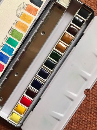 Caja metálica de acuarelas Winsor & Newton Professional. (No Cotman) Solo están probadas. Precio acorde a gama profesional y estado. - Contiene 14 pastillas de acuarela. 12 Colores clásicos + 2 añadidos. - Los colores son: Ivory Black, Payne's Gray, Burnt Sienna, Raw Sienna, Yellow Ochre, Permanent Sap Green, Winsor Green, Winsor Blue, French Ultramarine, Alizarin Crimson, Winsor Red, Winsor Yellow, Lemon Yellow y Chinese White. - La caja es metálica y está diseñada para transportar las acuarelas.