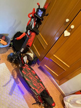 Patinete eléctrico Smartgyro con diseño inspirado en Red Bull. - Manillar con puños rojos. - Cables de carga rojos. - Ruedas negras con detalles rojos. - Plataforma negra con gráficos. - Luz frontal. Precio muy poco negociable lo tenia en 750 y lo he bajado a 450 y caro no es con todo lo q lleva q el patin cuesta mas de 1000 no mareantes no cambio por otro patin