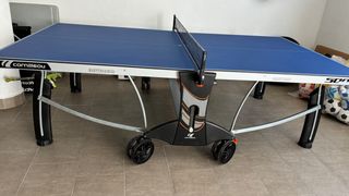 Mesa de ping pong Cornilleau modelo Outdoor, ideal para exteriores. Su diseño permite un fácil almacenamiento y transporte. - Superficie de juego azul. - Estructura robusta y resistente a la intemperie. - Ruedas para movilidad. - Red incluida.