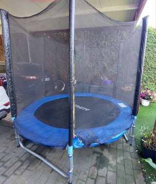 Cama elástica redonda con red de seguridad para niños. Mide unos 220cm de alto. La colchoneta está a unos 60cm de altura. El diámetro total, contando con el acolchado de seguridad es de 240 cm siendo 180 la superficie de salto. Las barras que tienen la red de seguridad están acolchadas. El cierre es con cremallera. Tiene algún arreglo pero se encuentra en buen estado.