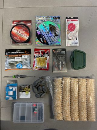 Lote de accesorios para pesca, ideal para casting y surfcasting. - Hilo de pesca VEGA Red Power Surf Competition 1000m. - Hilo de pesca ESARI Titanium SFL 300m. - Kit de señuelos Savage Gear Mini Sandeel. - Señuelos Hart Rock & Street. - Anzuelos Savage Gear. - Plomos de pesca. - Caja de pesca. - Flotador y perdigones.