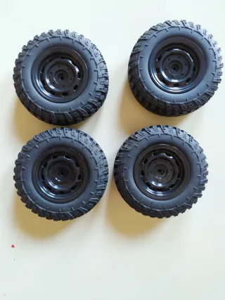 Lote de cuatro ruedas, completamente nuevas a estrenar+cardan MN82 Anclaje hexagonal de 5 mm Neumáticos de 73 mm de diámetro y 28 de ancho. Blandos y con muy buen agarre Llantas de 45 mm de diámetro, con montaje tipo "Beadlock" que evita que las gomas desllanten. Cubo externo, realizado en una pieza independiente del resto de la llanta y con diseño similar a una llanta de chapa real, muy conseguido y realista El precio es por las cuatro y no es negociable Pago por wallapop o entrega en mano Posibilidad tambien de pago por bizum o ingreso y envío por correo ordinario (coste 3,10 euros segun tarifa oficial de Correos).ñ