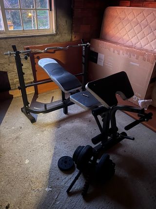 Banco de pesas multifuncional para entrenar en casa. Incluye barra y discos. - Banco con respaldo ajustable. - Soporte para barra. - También dispongo de unas mancuernas de 10 kg. - Barra z. - 2 barras para hacer mancuernas. - Discos de: 2 de 5 kg, 4 de 2,5 kg, 4 de 1,25 kg.
