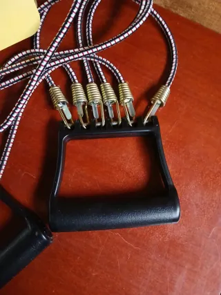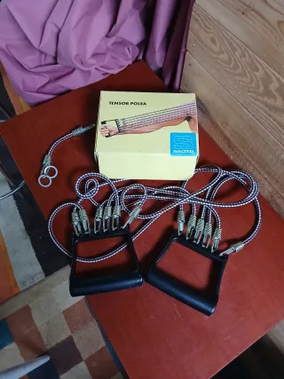 Tensor de polea de la marca Salter, ideal para ejercicios de fuerza. - Incluye dos asas ergonómicas. - Múltiples resortes para ajustar la resistencia. - Conexión con mosquetón y anillas.