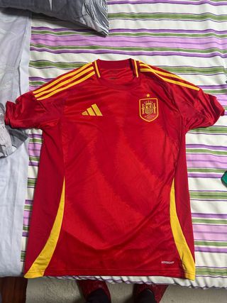 Camiseta de la selección española de fútbol, modelo para la Eurocopa 2024. - Diseño oficial Adidas. - Color rojo con detalles en amarillo. - Escudo de la RFEF bordado. - Tecnología AEROREADY para mayor transpirabilidad. Talla M