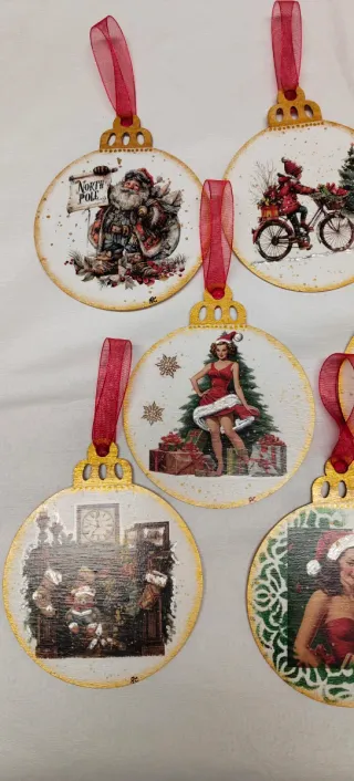 Conjunto de 12 bolas grandes o adornos navideños hechos a mano con técnica de decoupage. Se pueden vender en grupos de 6 unidades a 12,50€. Cada bola presenta un diseño vintage único. Son de madera y miden 10,8 cm de alto x 8,8cm de ancho. Decoración de árbol, guirnaldas , puertas ...Más estilos en mi perfil. Artículos libres de tabaco y humedad. - Diseños inspirados en la época navideña de los años 50. - Acabado artesanal con detalles brillantes.
