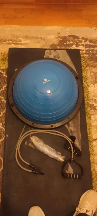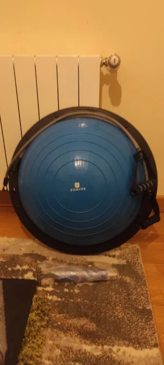 Plataforma de equilibrio BOSU de color azul, ideal para entrenamientos. - Incluye bandas elásticas para ejercicios. - Base negra resistente. - Bomba de inflado.