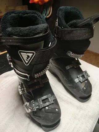 Botas de esquí Wedze WD300 en color negro. - Talla 24'5 equivale a una 38 - Acolchadas y calentitas - Cierre con 4 ganchos. - Correa de velcro en la parte superior. - Diseño con detalles geométricos.