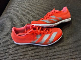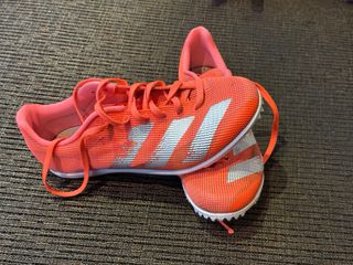 Zapatillas de atletismo Adidas con clavos, talla 36, color naranja y detalles plateados. En muy buen estado, con clavos de pista.