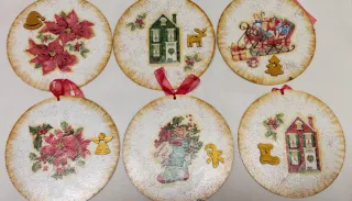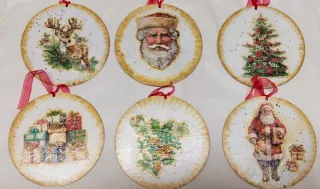 Conjunto de seis adornos navideños hechos a mano con la técnica de decoupage y CDs reciclados, van con cinta roja de organza para poder colgar. Llevan un adorno dorado de madera que representa una figurita típica. Cada adorno es circular y presenta un diseño festivo único. Miden 12cm de diámetro ideales para guirnaldas, puertas, árbol y un largo etc. - Diseños variados: poinsettias, casas, trineo con regalos, ángel, bota y reno. - Acabado con purpurina y borde envejecido.