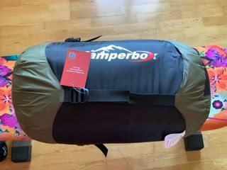 Saco de dormir nuevo en color verde oliva claro, relleno de poliester 1,5kg, mide 200x85cm.