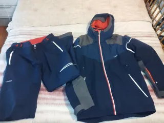 Conjunto de esquí para hombre de Decathlon. - Chaqueta azul con detalles en gris y rojo. - Pantalones de esquí azul marino. - Diseño deportivo y funcional. TALLA L tiene un pequeño corte en el pantalón como se ve en las fotos