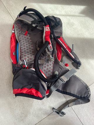 Mochila de senderismo y trail running Salomon Agile 17. - Color rojo y negro. - Compartimentos de malla laterales. - Incluye sistema de hidratación.