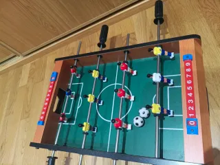 Mini futbolín de mesa para partidas divertidas. Ideal para tener en casa o llevar a reuniones. - Campo de juego verde con líneas blancas. - Jugadores de plástico en rojo y amarillo. - Marcadores de puntuación a cada lado.