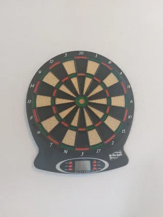Diana electrónica marca De Ves Sport con pantalla digital y botones de control. - Marcadores de puntuación visibles. - Diseño curvo con base integrada.