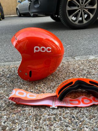 Conjunto de casco de esquí POC en color naranja brillante y gafas POCito a juego. El casco tiene el logo de POC en blanco y las gafas cuentan con una cinta elástica con el logo de POC repetido. - Casco de esquí POC. - Gafas de esquí POCito. Talla M