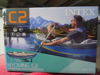 Canoa hinchable Wyoming C2, ideal para dos personas. Viene con remos y bomba de inflado. - Modelo: Wyoming C2 - Color: Azul y gris - Incluye: 2 remos y bomba de inflado - Estado: Nueva, sin estrenar