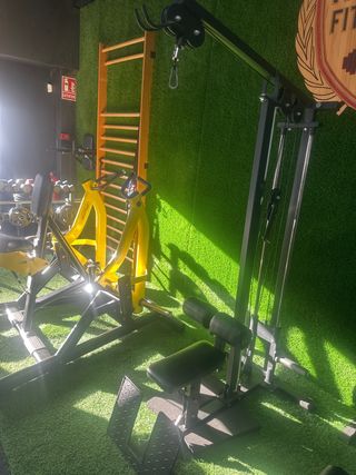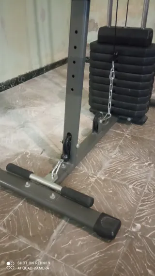 Máquina de placas para espalda con polea alta y baja. Tiene hasta 102 kg de peso. Buena máquina fuerte y robusta.Se sujeta a la pared y al suelo quedando firme.Se incluyen sirgas de acero , agarres para hacer remos gironda, cuerda tríceps, barras rectas y en V. Se puede separar en dos partes para facilitar el transporte.Preferiblemente interesados con medio de transporte ya que si no sale muy caro el envío.Yo la puedo transportar Máximo 50 klm de mi pueblo