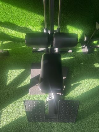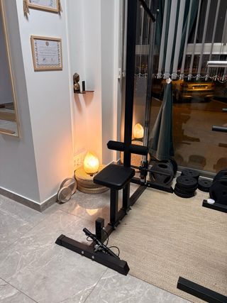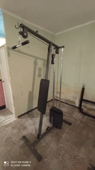 Vendo estación de poleas con banco acolchado y rodillos de sujeción para piernas, ideal para jalón al pecho, remo bajo y una gran variedad de ejercicios de fuerza en casa. Funciona con discos (no incluidos, pero tengo de todos los pesos a negociar) y permite ajustar fácilmente la carga para adaptarla a cualquier nivel hasta 200kg. Se regala un lote de agarres y accesorios de enganche para: • Pecho y espalda (barras de jalón, triángulo de remo, agarre neutro o similar). • Hombros, bíceps y tríceps (cuerda de tríceps, barra recta/curl y asas. - Estructura metálica robusta. - Asiento acolchado. - Compatible con discos de peso.