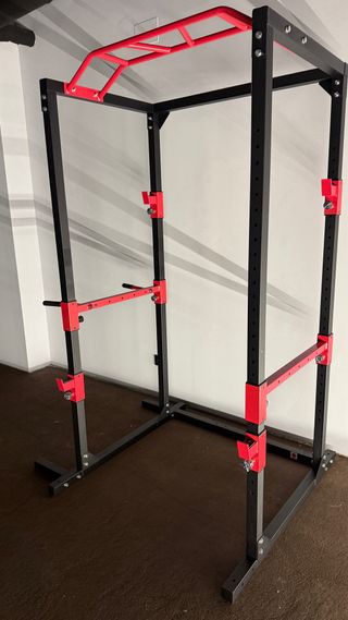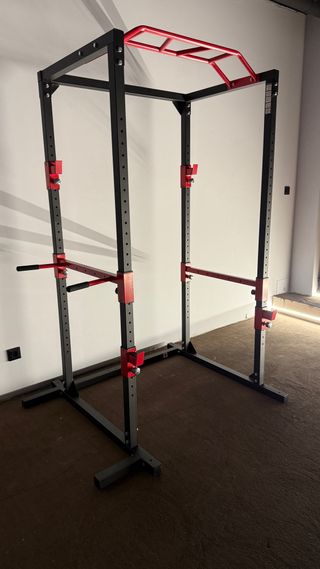 Rack de musculación NUEVO SIN USAR con estructura robusta y diseño moderno en color negro y rojo. Incluye barra de dominadas. Incluye doble polea para jalón y remo + agarre de barra recta que nunca se ha llegado a montar. - Barra de dominadas integrada. - Soportes ajustables para barra. - Estructura de acero resistente.