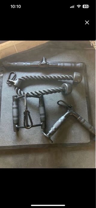 Conjunto de accesorios para polea de gimnasio. - Cuerda de doble agarre. 20€ - Barra recta. 15€ - Agarre de tríceps. 15€ - Agarre de remo. 20€ - Agarre de bíceps. 15€ - Dos agarres en J 15€ - Sistema de polea