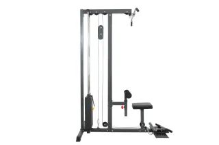 Equipo de gimnasio para ejercicios de jalón al pecho y remo. - Estructura metálica. - Polea con cable. - Accesorio de cuerda para polea.
