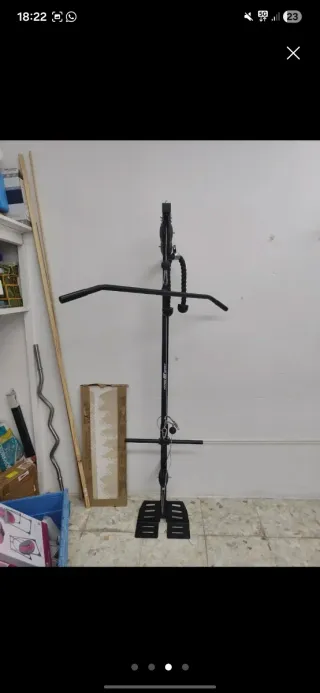 Máquina de gimnasio con polea superior e inferior. Polea gym ideal para entrenar tríceps,bíceps,remo y Jalón dorsal Se desmonta fácil para transportar,posibilidad de llevártela con furgo ,si es una distancia razonable - Estructura metálica. - Incluye barra y peso.