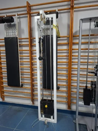 Polea alta y baja profesional de gimnasio de la marca QUINDO, dotada con 60 kg en placas, para trabajar todos los músculos de la parte superior (dorsal, jalones, remo bajo, hombros laterales y posteriores, pecho, tríceps, bíceps) es una polea simple de las de antes, old school, peso real, nada de poleas compuestas como lo que fabrican hoy en día, aquí sí que existe la repetición negativa, se le han puesto las sirgas nuevas, a pesar de sus años va muy muy fina, se puede ver y probar en gimnasio GYM GUAL de Zaragoza, consultar posible porte gratuito por la zona de Aragón y alrededores.