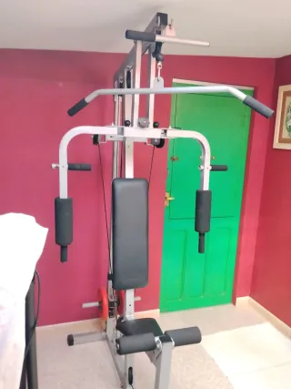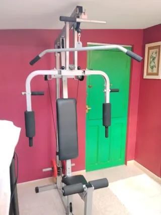 Vendo multiestación doméstica completa, ideal para montar tu gym en casa y entrenar todo el cuerpo sin salir. Permite múltiples ejercicios: Jalón dorsal (polea alta) Butterfly / pectoral mariposa Remo sentado (polea baja) Extensión de piernas / curl femoral Press de pecho, bíceps, tríceps y más Incluye el stack de placas de peso rojas de 10 Kgs cada una Altura 210 CMS, anchura 105 CMS, largo 120 CMS, ya montada. Estado general bueno: funciona al 100%, poleas suaves, cables en perfecto estado, tapizados enteros y sin roturas. Tiene algo de óxido superficial en la estructura y guías (fácil de limpiar o pintar con antioxidante)