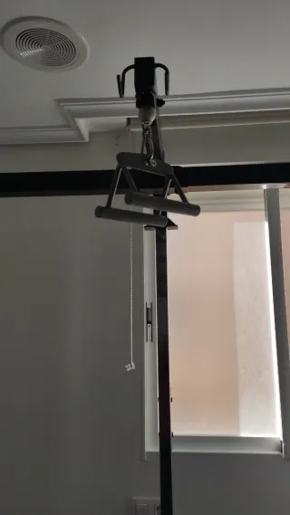 Máquina de gimnasio con polea superior e inferior. Polea gym ideal para entrenar tríceps,bíceps,remo y Jalón dorsal Se desmonta fácil para transportar,posibilidad de llevártela con furgo ,si es una distancia razonable - Estructura metálica. - Incluye barra y peso.