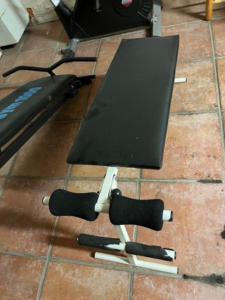 Conjunto de máquinas de gimnasio para entrenar en casa. - Máquina de abdominales con rodillos. - Banco de abdominales azul. - Máquina de ejercicios multifuncional.