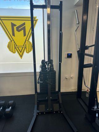 Equipo de gimnasio profesional con polea regulable. - Estructura metálica negra. - Torre de pesas con discos. - Sistema de poleas y cables. Menos de 1 año de uso. Como nueva. Precio nueva 2400€. 1600 unidad. Se venden 2. Precio comprando las dos 1500 / unidad Incluye manerales barra, remo, bíceps/tríceps.
