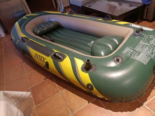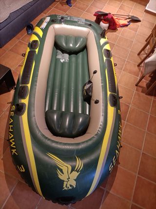 Barca hinchable Intex Seahawk 3, ideal para disfrutar del agua. Ideal para pantanos, embalses, ríos tranquilos o mar en calma. Muy estable y resistente. Incluye todo el pack: • Barca hinchable Intex Seahawk 3 • Remos • Hinchador manual • 2 chalecos salvavidas • Accesorios visibles en las fotos La barca admite motor hasta 1,5 HP (no incluido). Estado: usada, en buen estado general y completa. Se vende por falta de uso. Por tamaño y volumen, preferible entrega en mano, aunque se puede valorar envío a cargo del comprador. Cualquier duda, pregúntame sin problema.