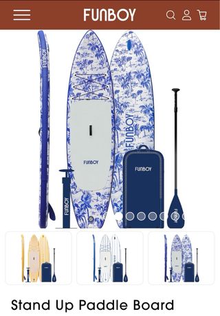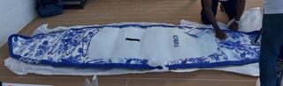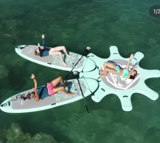 Tabla de paddle surf hinchable con un diseño tropical en azul y blanco. Incluye accesorios para su uso. Tabla hinchable premium de aprox. 351 cm de largo, 86 cm de ancho y 15 cm de grosor. Soporta hasta 150 kg. • Remo ligero ajustable. • Leash en espiral de aprox. 3 metros. • Quilla desmontable sobredimensionada. • Bomba manual de inflado rápido. • Mochila de transporte FUNBOY con estilo. Tabla de paddle surf nunca utilizada. Solo se abrió para un evento como elemento de decoración y después me la regalaron. No soy muy de deportes de mar, así que no la voy a usar. Si os interesa, contactad conmigo.