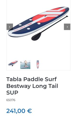 La Tabla de Paddle Surf Bestway Long Tail es apta para principiantes que quieran iniciarse en este deporte y que apuesten por descubrir los encantos de una práctica deportiva que puede ayudarles a relacionarse con el mar de forma distinta. Soporta un peso de hasta 145 kilogramos por lo que es apta para todo tipo de personas. Es hinchable lo que le permitirá disponer de su tabla cuando lo precise y guardarla correctamente en el lugar que decida. La resistencia de la tabla está garantizada y permite al usuario practicar este deporte con seguridad. Además, su diseño es idóneo para conseguir surcar las olas de la mejor forma posible ...
