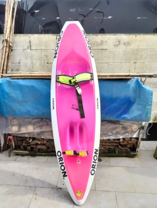 Waveski de la marca Orion en color rosa. Ideal para disfrutar del mar. Hecho en Hendaya, medida 225cmx65cmx40cm aprox - Incluye cincha de sujeción para cintura y pies regulable,remo y las 3 quillas
