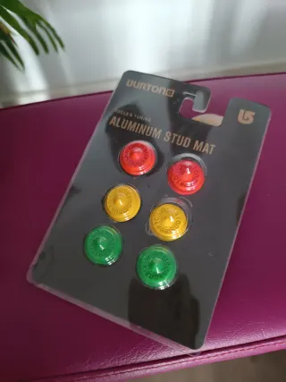 Set de 6 pinchos autoadhesivo Burton con forma de pinchos para la tabla de snowboard. Para que no se te resbale el pie de atrás cuando vas remando con una fijación quitada. - Dos tapones rojos. - Dos tapones amarillos. - Dos tapones verdes. - Material: Aluminio. - Autoadesivo 3M