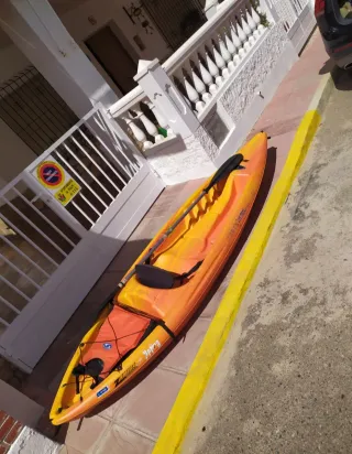 Kayak de recreo en buen estado, ideal para disfrutar del agua. Su diseño es llamativo y funcional. - Color naranja y amarillo. - Incluye remo. - Asiento integrado. Lleva ruedas para transportarlo y también un chaleco salvavidas Se encuentra nuevo listo para disfrutár para una plaza y media un adulto y un niño