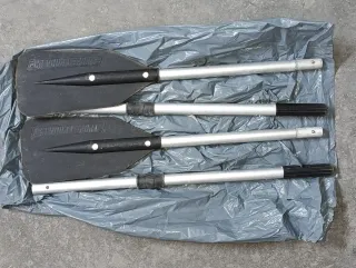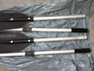 Set de cuatro remos para barco, ideales para actividades acuáticas. - Remos con palas negras y mangos de aluminio. - Empuñaduras negras texturizadas para un mejor agarre. - Diseño desmontable para facilitar el transporte y almacenamiento.