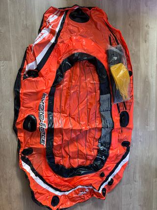 Kayak hinchable de hasta 3 plazas, ideal para disfrutar del agua. costó 518€ en decatlón lleva 2 remos,3 asientos, 3 chalecos, un bombillo manual, y una conexion para llenar con compresor. - Diseño en color naranja y negro. - Asientos -carro para transportar (se ha usado 4 veces literal)